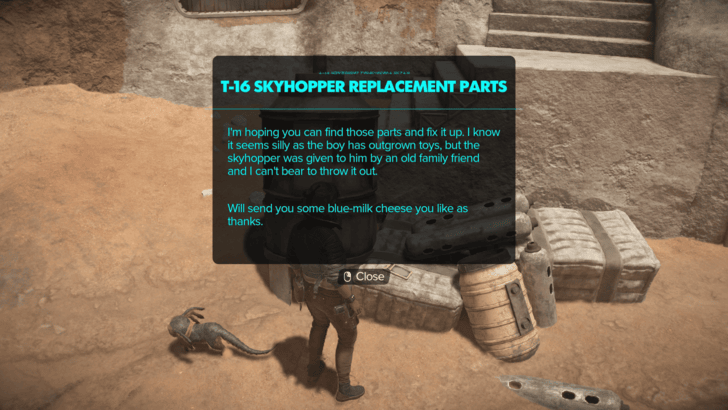 T-16 Skyhopper: Tatooine içerisindeki Lars Homestead bölgesinde T-16 Skyhopper hakkında bir veri tableti bulabilirsiniz. Bu, Luke’a Obi-Wan Kenobi tarafından verilen bir oyuncak idi.